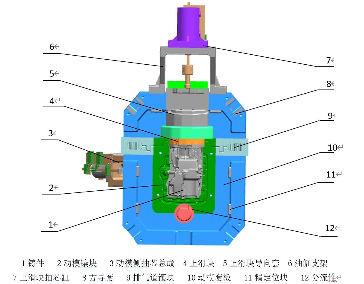表1 ADC12合金化學成分 wb/% 2.模具結構設計方案 油底殼在長邊方向的中間部位有直徑為Φ20 mm斜孔和直徑為Φ16 mm側向直孔,因此模具設計一側有動模斜抽芯,另一側有靜模側抽芯。當設計側向填充的澆注系統,會影響料缸和分流錐的布置。另外,油底殼長向法蘭面設計有多處螺栓安裝凸臺位置。為保證功能區的品質,油底殼模具的澆注系統設計成U型澆道,模具結構圖見圖2。壓鑄時金屬液從兩側充填,下方設計大容積的集渣包,上方充填末端設計曲面排氣道。模具的導向機構采用方形導柱、導套結構,并與套板上的精定位塊配合使用,既保證模具在開模過程中不受熱膨脹的影響,又能保證動靜模合摸后定位精度。