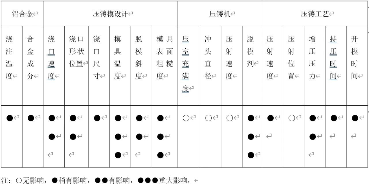 圖2 油底殼壓鑄模結構圖(動模) 3.油底殼粘料擦傷分析 粘料擦傷是壓鑄件主要缺陷之一,是指鑄件表面與型腔壁黏連,鑄件表面粗糙度被破壞,嚴重時會出現沿開模方向表面呈現條狀的拉傷痕跡。表2是鋁合金壓鑄件粘料拉傷成因對照表。