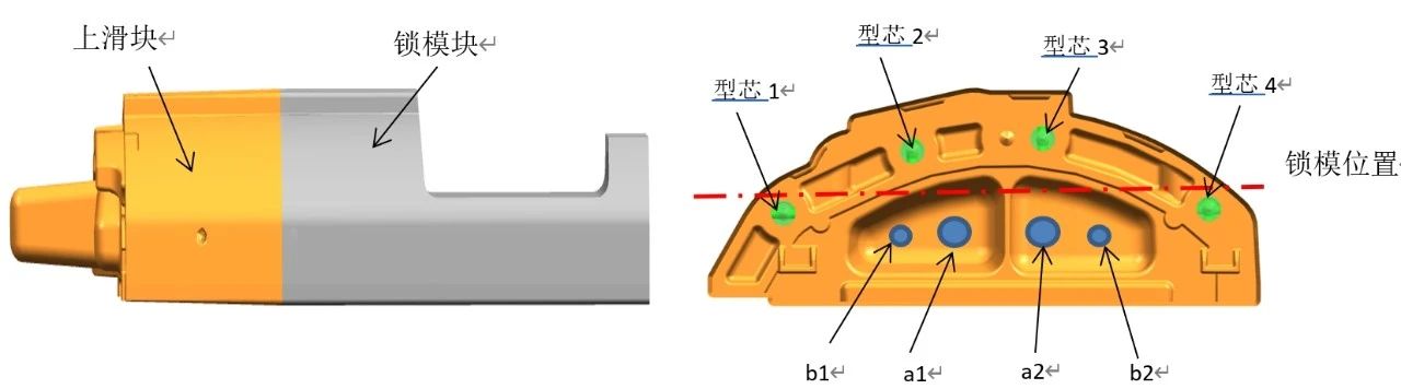 表2 鋁合金壓鑄件粘料拉傷成因對照表 基于上述鋁合金壓鑄件粘料拉傷成因對照表及經驗數據,綜合考慮發生率及嚴重度等因素,鋁合金鑄件粘料擦傷的主要原因如下:模具溫度太高;合金液澆注溫度過高;成型表面粗糙,拔模角度過小或負拔模角;脫模劑用量不足;鋁合金含鐵量太少,小于0.6%;澆道系統不正確使金屬液直接沖擊型芯或型壁; 此款油底殼出現粘料擦傷的位置是在滑塊成形處。從圖1及應用模擬軟件進行流動分析的結果來看,澆注系統設計合理,而且在充填過程中金屬液沒有直接沖擊產生缺陷部位的上滑塊。檢查模具上滑塊成形部位表面粗糙和拔模角、噴涂機器人的程序設置,均符合要求。將鋁合金中含Fe量控制在0.65%~1.1%,合金液澆注溫度控制在660±15 ℃,并進行其他工藝參數調整,發現對油底殼粘料缺陷位置和缺陷程度影響不大。 進一步對鑄件缺陷部位的形狀及模具結構進行分析,發現鑄件在上滑塊處壁厚厚大,金屬液在凝固過程中會產生大量熱量。而此處的成形上滑塊為保證排氣效果采用“隨形”結構,滑塊鎖模處無法將冷卻水管引出,所以冷卻水布置在滑塊下方,上滑塊型芯和上部分凸起的型腔沒有得到充分的冷卻,因此導致滑塊局部溫度過高。 4.模具結構的優化設計 根據分析,油底殼局部粘料擦傷的根本原因是因滑塊結構導致的模具冷卻不足,局部成形處溫度過高導致的,因此需對上滑塊進行結構優化,以加大模具冷卻效果。 4.1 上滑塊原結構及冷卻水布置 上滑塊優化前的結構見圖3。上滑塊總成由兩部分組成,由于鎖模位置以上區域冷卻水管無法引出,所以上滑塊冷卻水只布置在鎖模面以下位置,共4處噴管式冷卻。冷卻水a水道直徑∅15 mm兩處,冷卻水b水道直徑∅11 mm兩處,上滑塊型芯1~4無冷卻。