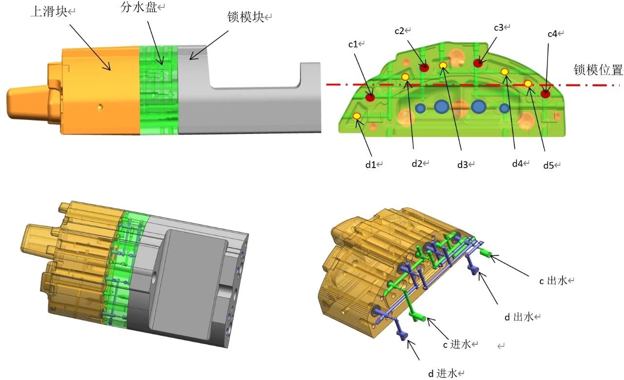 圖3 上滑塊優化前結構 4.2 利用分水盤結構加大冷卻 上滑塊優化后的結構見圖4,上滑塊總成由3部分組成,在上滑塊前端和鎖模塊中間增加“分水盤”。上滑塊在原有的4處點冷卻的基礎上,增加了4個型芯冷卻和5處型腔冷卻。上滑塊4個∅11 mm型芯上增加點冷卻,即冷卻水道c,直徑∅5 mm,共4處;在上滑塊成型處各凸起部位增加冷卻水道d,直徑∅8 mm,共5處。冷卻水道c1~c4通過分水盤實現串聯,并將冷卻水進出口位置引到鎖模面下方。同理,冷卻水道d1~d5通過分水盤實現串聯,并將冷卻水進出口位置引到鎖模面下方。通過設計獨立的分水盤,將冷卻水串聯并改變進出口位置,解決鎖模面以上無法設置冷卻水的問題,同時可以方便加工和更換。分水盤與上滑塊之間用氟橡膠O型密封圈進行端密封,分水盤前后端面有定位塊,實現與上滑塊和鎖模塊之間的精準定位,上滑塊總成中3個零件用4個M16螺栓連接固定。