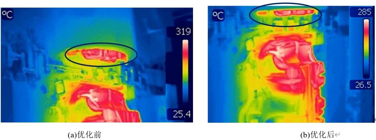 (2)模具優化后冷卻水帶走的熱量 在上滑塊上Qd 、Qw的變化忽略的情況下,模具優化后冷卻水帶走的總熱量Q2 = Q1+ Q'=0.0516α(Qd-Qw),冷卻能力是優化前的1.9倍。 5.優化設計的驗證 上滑塊結構優化加大冷卻能力后,上滑塊溫度得到有效改善,見圖5。優化前上滑塊噴涂前局部溫度最高為319 ℃,優化后同條件下局部溫度最高為285℃,溫度降低了34℃而且高溫區域明顯減小。優化后的模具按原工藝參數進行壓鑄,產品質量明顯改善。油底殼上滑塊4處預鑄孔內壁表面光滑,異形凹陷形狀處無粘料問題,徹底解決油底殼局部粘料擦傷的缺陷。優化后的模具經批量生產驗證,運行穩定可靠。