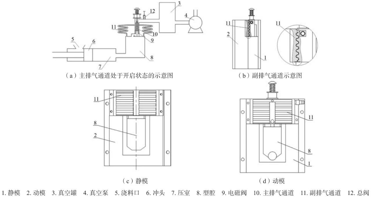 ![]() 原標題:鎂合金壓鑄真空抽氣系統的設計與應用研究 摘要:設計了一種含有主、副排氣通道的真空抽氣系統,主排氣通道較副排氣通道橫截面大,由真空閥控制其開閉,副排氣通道采用橫截面較小的齒狀排氣通道,在真空壓鑄過程中保持全程抽氣。研究表明:采用主、副排氣通道的真空抽氣系統,能夠獲得外觀完整、組織致密的鎂合金真空壓鑄件,氣孔率比齒狀排氣通道壓鑄件減少48%,T6熱處理后氣泡減少60%,鑄件的抗拉強度、屈服強度和伸長率分別提高9.3%、10.2%和21.4%。 真空壓鑄技術是在傳統壓力鑄造技術的基礎上輔以對型腔抽真空的技術。現行的真空壓鑄技術中,抽真空的方式主要有三種:第一種是當壓射沖頭越過澆口,碰到行程開關,型腔及壓室接通真空源,氣體被抽出,壓射沖頭繼續前進,快速壓射前,靠行程開關或時間繼電器關閉真空閥,停止抽氣,沖頭快速壓射,完成液態金屬成形,這種方法也稱半過程排氣;第二種是用“搓衣板”形冷卻塊,也稱“齒狀排氣道”進行全過程排氣,即排氣通道像兩個合起來的搓衣板樣形狀,液態金屬在充滿型腔后被擠入齒狀排氣道縫中凝固,終止排氣;第三種是瑞士方達瑞公司推出的雙芯真空閥的真空壓鑄系統,它是全過程排氣,閥門在型腔尾部,在金屬液充滿型腔到達閥門時,依靠金屬液流動慣性力將真空閥關閉。不難看出,第一種方式液態金屬到達型腔入口停止排氣,殘留一部分氣體未排掉;第二種方式排氣道是彎曲的窄縫,排氣管道長,盡管是全過程排氣,也很難把氣體充分排掉;第三種方法能全過程充分排氣,也無第二種方法所凝固在齒狀排氣道中的廢料,是目前比較理想的方法,但真空閥從得到關閉閥門信號,到閥門完全關死,時間極短,以毫秒計算,閥門一次性成本高,要定期進行維護,維護費用也較高,對使用人員素質要求也高,這些因素限制了該系統在真空鑄造中的廣泛應用。 針對現行真空壓鑄中真空系統所采用的半過程排氣方法存在殘留氣體多、齒狀排氣道排氣能力低以及全過程排氣真空閥成本高的現狀提出的一種新的抽真空方法。該方法是采用主、副排氣通道同時對型腔進行抽氣,即半過程排氣和齒狀全過程排氣兩者并用,此方法克服半過程排氣殘留氣體多和齒狀排氣道排氣速度慢的缺點,能夠有效地提高型腔真空度,獲得組織致密的壓鑄件。 1.真空抽氣系統 含有主、副排氣通道的真空抽氣系統由主排氣通道、齒狀副排氣通道、真空罐、真空泵和模具型腔等組成,如圖1所示。該真空抽氣系統的工作原理:總閥12關閉,真空泵4將真空罐3抽成具有一定真空度的待用狀態,電磁閥9處于開啟狀態,通過澆料口將定量金屬液倒入料筒,啟動壓射沖頭6,當壓射沖頭越過澆料口5并觸動感應開關時總閥12打開,這時副排氣通道11和主排氣通道10同時對與壓室、真空罐連成一起的型腔進行抽氣,當壓射沖頭推動金屬液體向前運動,觸動快壓射感應開關,電磁閥9靠電磁力快速向下運動關閉主排氣通道,而副排氣通道11繼續對型腔進行抽氣直到液態金屬充滿型腔并進入齒狀副排氣道的窄縫而冷卻凝固,最后獲得真空壓鑄件,其結構見圖1。