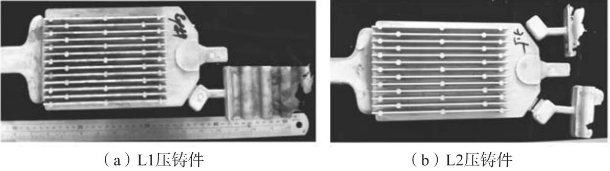 圖5 鑄件金相組織圖 3.3 真空壓鑄件熱處理性能分析 壓鑄件通過T6處理后的宏觀形貌,見圖6。試驗L2壓鑄件散熱片表面出現了7~8個大小不一的氣泡,其中較大的2個直徑達到6 mm,其余直徑為0.4~3 mm。而試驗L1壓鑄件散熱片表面只有1片出現了直徑為1.5 mm的氣泡。由圖分析可知,試驗L1采用主、副排氣管道的新型真空抽氣系統能夠有效地減少鑄件內部的氣體,減少縮松、縮孔等缺陷,從而提高鑄件的致密度,提高鑄件整體的力學性能。