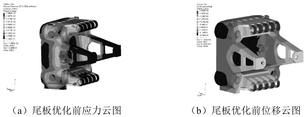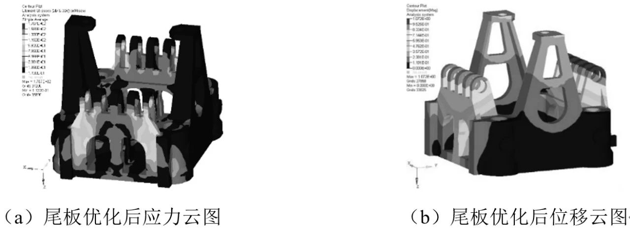 圖10 定模板優(yōu)化后有限元分析結(jié)果 3.2 尾板拓?fù)鋬?yōu)化設(shè)計(jì) 尾板的拓?fù)鋬?yōu)化控制參數(shù)設(shè)置過程和定模板相似,最小結(jié)構(gòu)尺寸(MINDIM)還設(shè)置為設(shè)計(jì)空間平均單元尺寸的2倍。最終選定參數(shù)見表3: