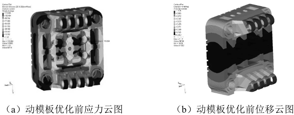 圖6 尾板優(yōu)化前有限元分析結(jié)果 動(dòng)模板的應(yīng)力與變形分布圖見圖7,其最大應(yīng)力值115 MPa位于加強(qiáng)筋板靠近沉臺(tái)附近,結(jié)構(gòu)最大變形量為1.12 mm。