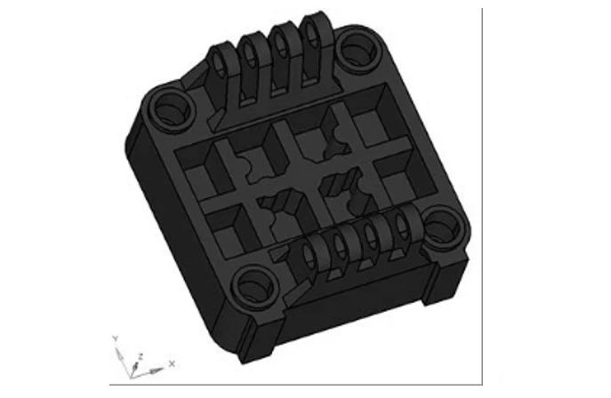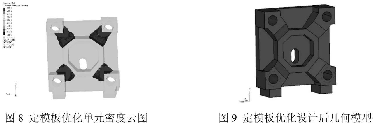 表2 定模板優(yōu)化控制參數(shù) 經(jīng)過16次迭代后得到定模扳的相對(duì)密度云圖,設(shè)置單元密度閾值為0.5,結(jié)構(gòu)中單元密度低于0.5的部分將以半透明狀顯示,見圖8。去除單元相對(duì)密度為0的區(qū)域,保留單元相對(duì)密度為1的高亮區(qū)域,對(duì)于單元密度值位于0.5~1的區(qū)域,以質(zhì)量最小化為目標(biāo)進(jìn)行部分刪減,并結(jié)合實(shí)際制造可行性,最終確定定模板優(yōu)化后的幾何模型見圖9。