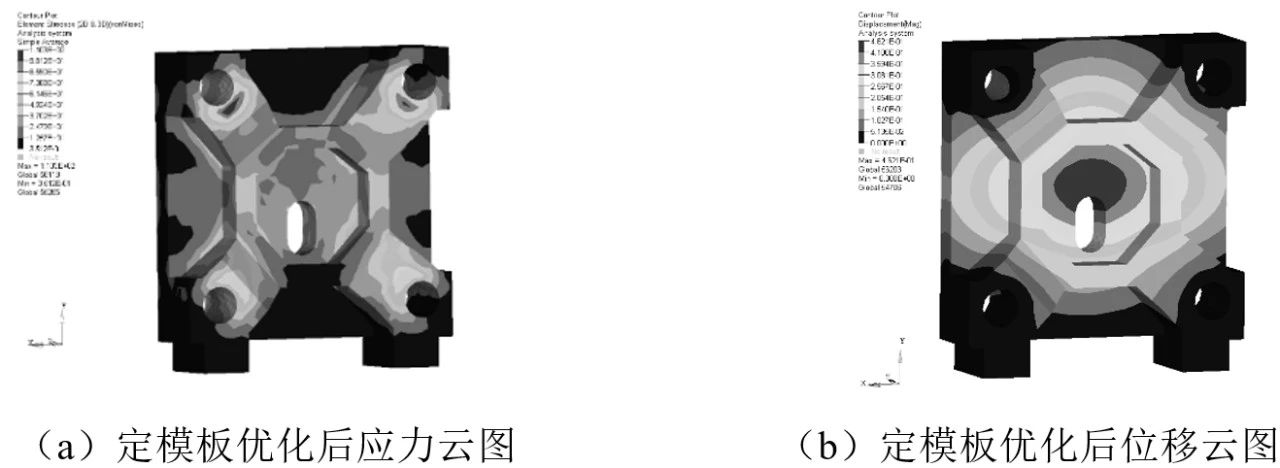 圖15 動(dòng)模板優(yōu)化后有限元分析結(jié)果 通過對(duì)壓鑄機(jī)定模板、尾板的拓?fù)鋬?yōu)化及對(duì)動(dòng)模板的尺寸優(yōu)化,三大模板的整體關(guān)鍵尺寸并未發(fā)生變化,局部應(yīng)力、變形以及整體重量有了明顯的改變。優(yōu)化前后結(jié)構(gòu)參數(shù)對(duì)比見表4。