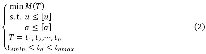 式中,T為設(shè)計(jì)變量;M(T)為結(jié)構(gòu)質(zhì)量;u和[u]為結(jié)構(gòu)的位移量和最大允許位移量;σ和[σ]為結(jié)構(gòu)的應(yīng)力和最大允許應(yīng)力;te為第e個(gè)單元的厚度;n為單元的數(shù)量;temin和temax分別為第e個(gè)單元允許的最小厚度值和最大厚度值。 同時(shí),式(1)和式(2)需滿足K-T條件(庫恩—塔克條件):