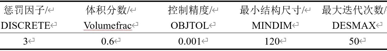 圖7 動(dòng)模板優(yōu)化前有限元分析結(jié)果 3.定模板和尾板的拓?fù)鋬?yōu)化 3.1 定模板拓?fù)鋬?yōu)化設(shè)計(jì) 以單元密度作為設(shè)計(jì)變量,以模板重量最小、變形量最小作為優(yōu)化約束條件,通過變密度法在Optistruct模塊中對(duì)定模板進(jìn)行拓?fù)鋬?yōu)化。涉及到的控制參數(shù)主要有懲罰因子(DISCRETE),優(yōu)化體積百分比(Volumefrac),控制精度(OBJTOL),最小結(jié)構(gòu)尺寸(MINDIM),最大迭代次數(shù)(DESMAX)等,其中懲罰因子和體積百分比為主要影響因素。 因此首先改變懲罰因子的大小,其他控制參數(shù)依據(jù)經(jīng)驗(yàn)進(jìn)行設(shè)置并保持不變。迭代完成后,發(fā)現(xiàn)隨著懲罰因子由2、3到4的逐漸增大,定模板剛度逐漸增大,然而懲罰因子取值過大也會(huì)導(dǎo)致優(yōu)化后的結(jié)構(gòu)可制造性差。 接著改變優(yōu)化體積百分比的大小,其他控制參數(shù)保持不變,懲罰因子設(shè)置為3。迭代完成后,發(fā)現(xiàn)隨著體積百分比由0.6、0.4到0.2的逐漸降低,結(jié)構(gòu)剛度逐漸減小,迭代步數(shù)逐漸增加,因此也會(huì)導(dǎo)致優(yōu)化計(jì)算的時(shí)間增長。 基于以上迭代歷程的情況,最終選定拓?fù)鋬?yōu)化控制參數(shù)見表2。