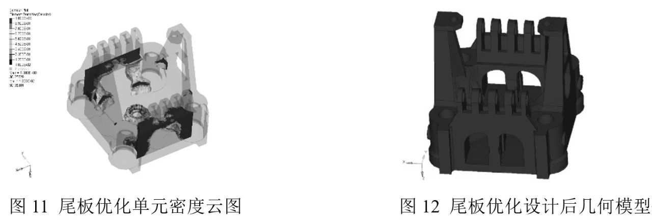 表3 尾板優(yōu)化控制參數(shù) 經(jīng)過18次迭代后得到尾板的相對(duì)密度云圖,設(shè)置單元密度閾值為0.4,結(jié)構(gòu)中單元密度低于0.4的部分將以半透明狀顯示,見圖11。根據(jù)拓?fù)鋬?yōu)化單元密度結(jié)果重新確定尾板的設(shè)計(jì)方案,可在尾板與機(jī)鉸系統(tǒng)相連接的上下兩側(cè)分別增添兩個(gè)半拱形孔,優(yōu)化后的尾板幾何模型見圖12。