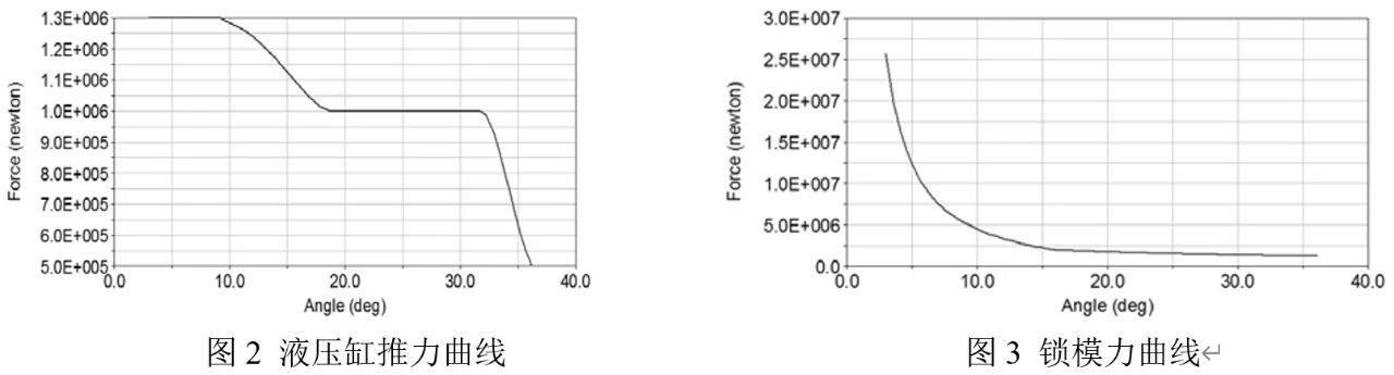經(jīng)過仿真分析,得到合模機(jī)構(gòu)中各主要參數(shù)的時(shí)間歷程曲線。液壓油缸的推力、鎖模力隨時(shí)間變化的曲線見圖2和圖3。最大液壓缸推力為
