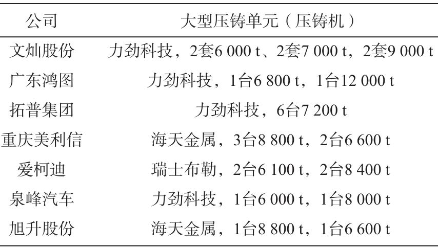 表1 國內一體壓鑄規模 2.一體化壓鑄技術壁壘 目前一體化壓鑄技術壁壘主要體現在四個方面:大型壓鑄機,免熱處理鋁合金材料配方、壓鑄模具設計、真空壓鑄工藝。 2.1 大型壓鑄機 大型壓鑄機行業進入門檻高,對理論、經驗及制造工藝有很高的要求,同時,大型壓鑄機的開發周期非常長,前期投入大,造價高(1臺壓鑄機平均需要1億元人民幣)。一體化壓鑄要求壓鑄機鎖模力至少大于6000 t(傳統高壓壓鑄的鎖模力通常在5000 t以下)。2021年10月,瑞士布勒公司推出Carat840/920超大型兩模板壓鑄機(圖2),鎖模力高達92000 kN,兩套Carat 840壓鑄島交付沃爾沃公司托斯蘭達工廠,實現一體化壓鑄。意大利意德拉IDRA公司(力勁子公司)開發的OL6200CS壓鑄機,該壓鑄機長19.5 m、寬5.9 m、高5.32 m,大小相當于一塊羽毛球場地,平臺的有效尺寸長和寬2.35 m,工作臺空間可以放下長寬高尺寸在2 m以內的任何零件,可以提供最大6218 t的鎖模力。根據瑞士布勒公司在2011年申請的專利,其能夠將鑄造模具之間形成空腔,向空腔中注入鋁液,經抽真空在模腔中產生負壓,能夠有效消除鑄造紊流產生的氣孔,有助于提高壓鑄零件的內部致密性。國內壓鑄機廠力勁在全球壓鑄機市場的占有率超過40%,率先開發出6000 t壓鑄機(圖3),目前已開發出12000 t壓鑄機。海天金屬2021年4月在重慶美利信全球首發HDC8800 t壓鑄機,可實現包括新能源汽車在內的車身、底盤等大型結構件一體化。伊之密公司7000 t壓鑄機也即將總裝。