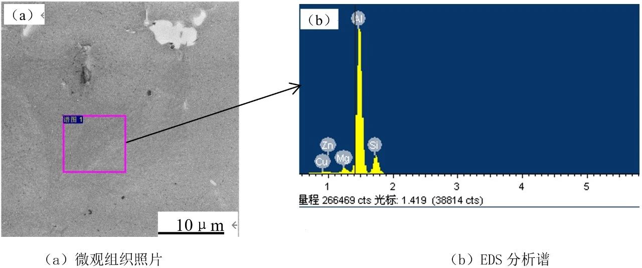 圖3 YL104合金與Al-Si-Mg-Cu合金的金相組織照片 圖3為YL104壓鑄合金和Al-Si-Mg-Cu合金的組織對比,可以看出,兩種合金中白色組織為α-Al基體,枝晶間灰色組織為共晶組織,但Al-Si-Mg-Cu合金中α-Al基體更加圓整,尺寸明顯變小,最小可達到3μm。其中圖3c中能發現部分粗大的α-Al,這部分粗大的枝晶應該是在壓室內形成的,在壓室內凝固、長大,最后被沖頭壓入型腔形成的。由于放大倍數的限制,還有部分黑色未知組織需進行更細微的分析。 根據Al-Si-Cu相圖,當Mg含量為0.5%,銅含量≤0.5%時合金凝固后相組成為[α-Al+Si+Mg2Si+Al5Mg8Cu2Si6],由于Mg、Cu、Zn等合金元素含量較少,添加的Mg、Cu、Zn等合金元素大部分都溶解于Al基體中,因此在微觀組織照片中很難發現以上元素形成的特征相。通過EDS分析發現α-Al基體中溶有Mg、Cu、Zn、Si等合金元素,起到固溶強化的作用,見圖4。