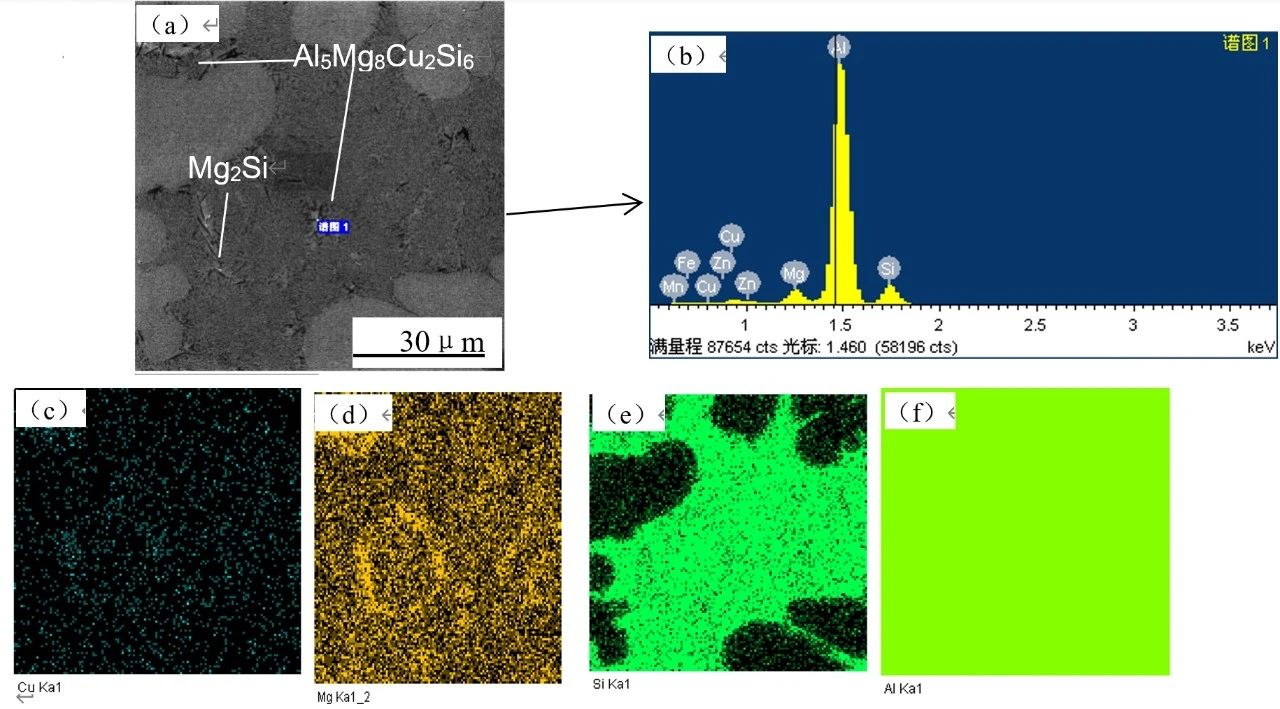 圖7 時效后Al-Si-Mg-Cu合金的組織和EDS分析(a)SEM照片(b)EDS分析譜(c)Cu元素的分布(d)Mg元素的分布(e)Si元素的分布(f)Al元素的分布