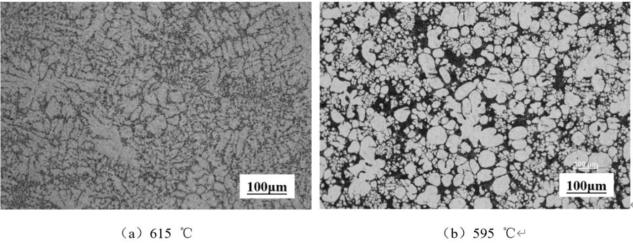 澆注溫度直接決定了漿料進入模具型腔時所含的熱量,澆注溫度越高,漿料中所含固相晶粒越少,同時也會直接影響漿料在模具中的凝固速率,最終影響合金的本體組織。在澆注溫度為615 ℃時,由于漿料溫度接近液相線(615.8 ℃),因此,進入模具前不會有固相晶粒的析出,只會在模具充型的過程中少量析出。另外,剩余液相由于在模具中散熱較慢,因此大部分會凝固成為枝晶狀或者薔薇狀。當澆注溫度為595 ℃時,漿料中所含的熱量一定程度的減少,漿料進入模具前就會生成一定量的初生晶。剩余液相所含熱量也隨之減少,因此組織晶粒基本為薔薇狀或球狀晶粒;當澆注溫度為575 ℃時,此時的漿料溫度較低,所含熱量較少,在充型前漿料中會存在大量的初生晶。充型的過程中,漿料中不斷析出新的晶粒,同時伴隨著漿料的自攪拌行為,晶粒趨于細化和圓整化,并在漿料中均勻分布,因此組織中的晶粒基本呈球狀,且固相率較高。綜上,當澆注溫度為575~615 ℃時,隨著澆注溫度降低,剩余液相中形成的晶核不會被重熔,漿料中的初生晶數量增多,固相率升高,并且在充型的過程中晶粒變得細小圓整且分布均勻。