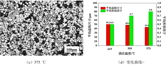圖6 不同澆注溫度下流變擠壓鑄造Al-Si-Mg鋁合金的本體金相組織及其變化曲線