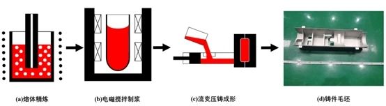 圖1 Al-Si-Mg鋁合金構件半固態流變壓鑄成形流程示意圖及鑄件