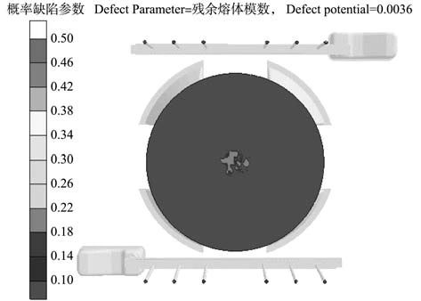 圖11 凝固過程 2.3.5 殘余熔體模數模擬 圖12為鑄造過程中活塞殘余熔體的仿真結果。從圖中可以看出,殘余熔體模數面積相比于首次,明顯降低,由于此位置較厚,縮孔無法完全消除,但有縮減趨勢。