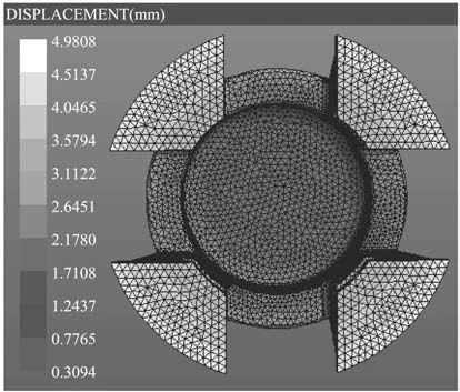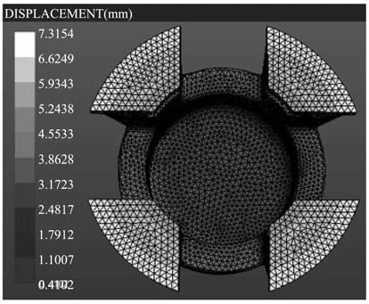 圖6 殘余熔體模數 在底腳對面位置有2%出現縮孔的概率,此位置為非加工面,不得有縮孔缺陷,因此有必要通過調節溫度場來降低縮孔發生的概率。 2.2.5 應變模擬 圖7為應變模擬結果。活塞在工作時底腳與地面接觸,靠此位置支撐,要求變形量小,結果顯示變形量最大為7.3 mm。
