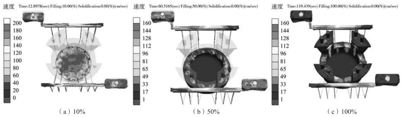 圖8 鑄造工藝優化 2.3.2 充型速度場模擬 圖9為充型速度場的仿真結果。從圖中可以看出,金屬液首先充填底部,然后往上充填,底腳為最后充填位置,經過120 s完成鑄件的整體充型。通過分析云圖可以得知,充型10%時,鐵液底部稍有起伏,有輕微不平穩現象,速度最高為135 cm/s;充型至50%,速度有所降低,最高為120 cm/s;充型結束時,鐵液速度變為平穩,最高為100 cm/s。相比于首次,速度降低。