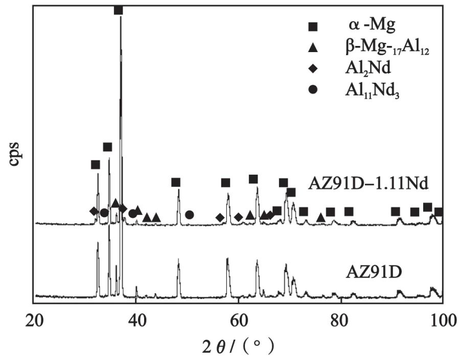圖1 壓鑄試樣及兩種合金的壓鑄流動試樣對比 采用等離子體原子發射光譜儀(ICP)分析合金中Nd含量為1.11%。金相試樣從壓鑄拉伸試樣相同部位切取,腐蝕劑選用5%硝酸酒精,接著在Leica DMI 3000M型光學金相顯微鏡(OM)及JEOL HXA-8100型掃描電子顯微鏡(SEM)上進行顯微組織和EDS分析;在采用銅靶的SmartLab型 X 射線衍射儀(XRD)上進行物相分析。采用DNS200 型萬能材料試驗機進行室溫和高溫(423 K)拉伸試驗,進行高溫拉伸試驗前試樣在該溫度保溫10 min,拉伸速度2 mm/min;采用 MH-5L型顯微硬度儀進行顯微維氏硬度(HV)測試,載荷9.8 N,加載時間20 s;采用DRPL-2C型熱導率測試儀測試導熱性能;測量流動試樣長度來表征合金的流動性能。 2、試驗結果與討論 2.1?顯微組織 圖2為AZ91D與AZ91D-1.11Nd合金壓鑄試樣的X射線衍射圖譜。可見,AZ91D合金壓鑄態XRD譜主要由α-Mg和β-Mg17Al12兩種相峰組成,而AZ91D-1.11Nd壓鑄態XRD譜除出現上述α-Mg、β-Mg17Al12相的峰之外,還出現Al2Nd和Al11Nd3新相的峰,但沒有出現Mg-Nd二元相或Mg-Al-Nd三元相的峰。