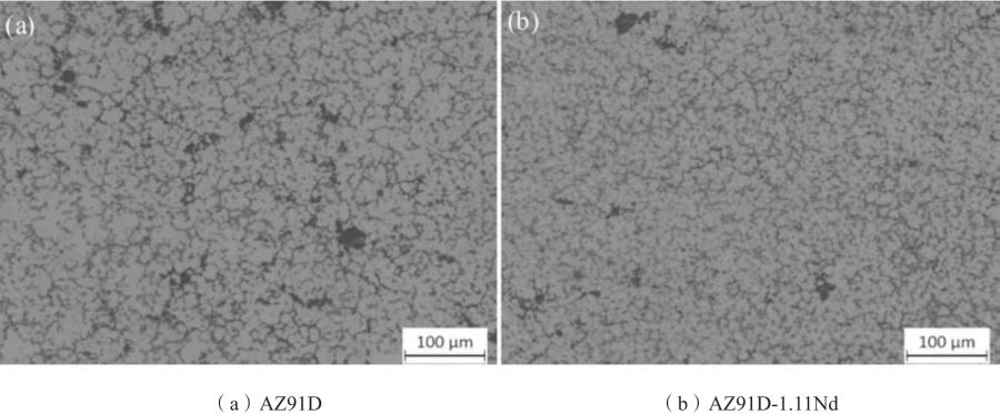 圖2 壓鑄態AZ91D與AZ91D-1.11Nd合金的X射線衍射圖譜 圖3為AZ91D與AZ91D-1.11Nd合金壓鑄試樣的金相照片。可見,AZ91D合金的微觀組織主要由白色的α-Mg基體和灰色、呈網狀沿晶界分布的β-Mg17Al12組成,平均晶粒尺寸約38 μm。添加1.11%Nd后,晶粒有所細化,平均晶粒尺寸降至約23 μm。