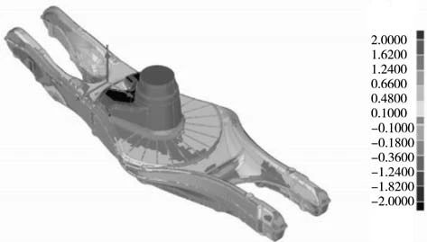 圖10 產(chǎn)品實物 產(chǎn)品尺寸采用3D掃描設(shè)備進行掃描檢測,檢測結(jié)果發(fā)現(xiàn)產(chǎn)品兩側(cè)支臂有一定形變,如圖11,形變的原因主要來源于冷卻過程中產(chǎn)品內(nèi)部產(chǎn)生的組織應(yīng)力,從檢測結(jié)果上來看變形量小于1 mm,鑄造設(shè)計加工余量為2 mm,對加工影響較小,產(chǎn)品輪廓度要求為3 mm,滿足客戶要求。