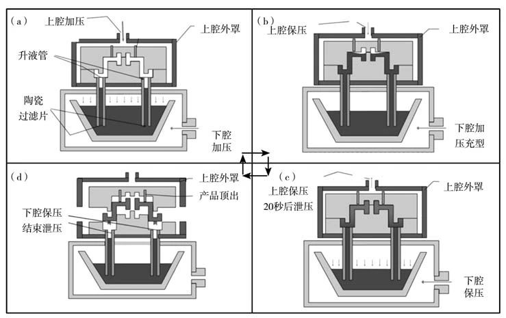 圖1 后下擺臂的3D模型 產(chǎn)品尺寸為:500 mm×300 mm×45 mm(高),產(chǎn)品彈簧面的平面度要求為1 mm,產(chǎn)品重量3.5 kg。 1.2 內(nèi)部組織及缺陷要求 后下擺臂的內(nèi)部缺陷需要100%的X光檢測,按照ASTM E155進行檢測,關(guān)鍵區(qū)域的內(nèi)部缺陷不能高于1級,非關(guān)鍵區(qū)域的內(nèi)部缺陷標準不能超過2級,兩枝晶間距小于50 μm,金相檢測參照ASTM 1030執(zhí)行。 2、差壓鑄造工藝 2.1 設(shè)備介紹 本企業(yè)采用保加利亞產(chǎn)差壓鑄造機(CPC),該設(shè)備共有96路可以獨立控制的冷卻水,設(shè)備工作壓力上腔可以達到0.15 MPa,下腔可以達到0.3 MPa,設(shè)備型號為CPC-1600,可安裝最大模板直徑為1 243 mm,最大模架高度為800 mm,鋁液溫度控制精度為±5 ℃,壓力控制精度為100 Pa。 2.2 差壓工藝步驟 差壓鑄造法是20世紀60年代初發(fā)展起來的鑄造新方法。這種方法源于低壓鑄造,它兼有低壓鑄造和壓力釜鑄造的特點。 本企業(yè)使用的差壓鑄造機的工藝步驟如圖2。上下腔同時增壓(圖2a)→上腔壓力保持的同時,下腔按照充型曲線進行增壓充型(圖2b)→壓力下結(jié)晶(圖2c)→上腔泄壓下腔增壓補縮(圖2c)→冷卻(圖2d)→產(chǎn)品頂出(圖2d)。
