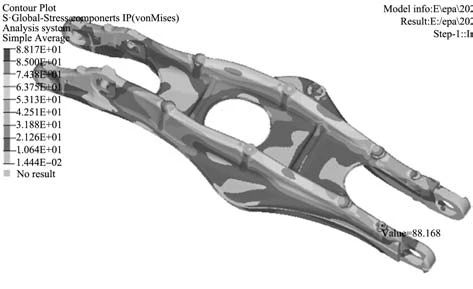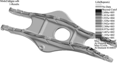 圖2 拉伸試樣及拉伸夾具示意圖 差壓鑄造與低壓鑄造比主要的工藝差異為:①壓力下結(jié)晶:低壓鑄造在大氣壓下進行結(jié)晶,差壓鑄造結(jié)晶時的壓力由設(shè)備控制,本企業(yè)的結(jié)晶壓力為0.15 MPa,高的結(jié)晶壓力可以使產(chǎn)品的力學(xué)性能有一定提升;②增壓補縮:差壓鑄造壓力下結(jié)晶階段結(jié)束后,上腔壓力恢復(fù)成大氣壓,坩堝與上腔的壓力差從0.06 MPa提升到0.21 MPa,補縮壓差比設(shè)備低壓模式的0.06 MPa高2倍以上,產(chǎn)品補縮能力進一步加強。 3、產(chǎn)品全壽命周期流程 根據(jù)客戶提供的產(chǎn)品各安裝面的空間裝配要求以及載荷要求開始:產(chǎn)品設(shè)計→CAE分析→產(chǎn)品毛坯設(shè)計→模流分析→模具設(shè)計→產(chǎn)品試制→X光檢測→熱處理→力學(xué)性能檢測。 3.1 產(chǎn)品結(jié)構(gòu)設(shè)計 依照產(chǎn)品結(jié)構(gòu)特點,在設(shè)計過程中充分地考慮了差壓鑄造設(shè)備的特點及工藝能力,將產(chǎn)品的彈簧接觸面設(shè)計為加工余量為2 mm的毛坯面。根據(jù)后下擺臂的產(chǎn)品特點,將左右件設(shè)計成同一種結(jié)構(gòu),并在產(chǎn)品上設(shè)計左右手凸臺標識,不同機加工程序保留不同凸臺標識。 3.2 產(chǎn)品 CAE 分析 根據(jù)客戶要求對產(chǎn)品進行強度分析如圖3、疲勞分析如圖4。從分析結(jié)果上看,零件整體受力均勻,極限強度小于材料強度,從兩根縱向分布的筋向周圍平面過渡自然,沒有應(yīng)力集中的情況,強度分析和疲勞分析的結(jié)果均合格,作為底盤安全件,滿足客戶規(guī)定的壽命要求。經(jīng)過CAE分析產(chǎn)品滿足客戶要求。
