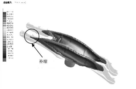 圖6 網(wǎng)紋設(shè)計 3.4 產(chǎn)品模流分析 由于產(chǎn)品為薄壁件,差壓鑄造由于上腔壓力大,凝固速度較低壓鑄造快,產(chǎn)品的補縮時間不足,設(shè)計時不僅要考慮近澆道區(qū)域的充足補縮,還需要考慮遠澆道區(qū)域的補縮需求量,盡量將遠澆道的補縮需求量降低。針對于客戶對產(chǎn)品關(guān)鍵區(qū)域的內(nèi)部缺陷不大于1級、非關(guān)鍵區(qū)域不大于2級的要求,根據(jù)模流分析結(jié)果進行結(jié)構(gòu)細微調(diào)整,將鑄造凝固模擬的補縮狹長位置從關(guān)鍵區(qū)域移動到非關(guān)鍵區(qū)域,保證CAE分析中的關(guān)鍵區(qū)域不會產(chǎn)生超過1級缺陷。 從模擬中可以看出產(chǎn)品基本按照順序凝固,但由于產(chǎn)品壁厚較薄,階段凝固部分均會產(chǎn)生狹長的液相區(qū)殘留,如圖7中標識“補縮”區(qū)域,需要在實際生產(chǎn)中來確認是否會產(chǎn)生缺陷。