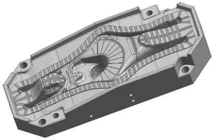 圖7 產(chǎn)品凝固過程模擬 產(chǎn)品的冷卻水設(shè)計如圖8,CPC設(shè)備單臺機擁有96路可以獨立控制的冷卻水,針對產(chǎn)品接近同時凝固的設(shè)計理念,對產(chǎn)品多數(shù)壁厚差異不大的位置均設(shè)計冷卻水。水溫設(shè)置為30 ℃,水流量為5 L/min。