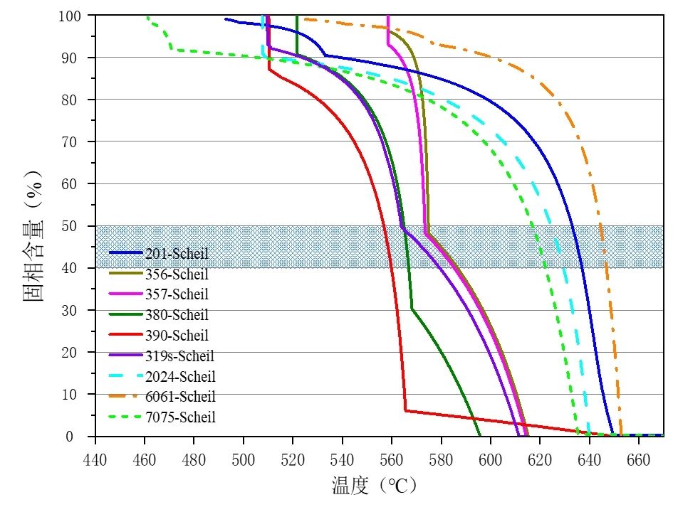 表1 高固相含量流變制漿技術 近年來,漿料制備技術的相關研究主要集中在解決非亞共晶Al-Si系鋁合金的漿料制備難題上。在漿料制備過程中,接近散熱通道的熔體冷卻較快,遠離散熱通道的熔體冷卻較慢,因而漿料內部不可避免存在溫度差異,也存在固相含量差異。圖1為不同鋁合金的固相含量隨溫度的變化曲線。可以看出,在40%~50%固相含量區間,7075鋁合金(非Al-Si系)的曲線斜率大于356鋁合金(Al-Si系),即7075鋁合金的固相含量對溫度變化更敏感。因而,非亞共晶Al-Si系鋁合金半固態漿料的制備對漿料溫度場均勻性控制提出了更高的要求。