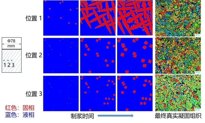 (a)7108、(b)6063、(c)7050 值得注意的是,近年來模擬仿真技術被應用于制漿技術的研究。LI G等采用有限元方法模擬了漿料溫度場在電磁場作用下的演變。QU W Y等采用相場法模擬了SEED法制漿過程中α-Al晶粒的長大和形貌演變,見圖3,并分析了溫度場、流場和成分場對α-Al晶粒的長大和形貌演變的影響規律,為漿料制備技術優化提供了參考。
