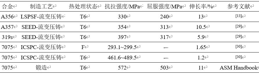 圖3 微觀組織長大過程模擬仿真結果與真實凝固組織對照 2、高性能鋁合金材料 目前,高固相流變壓鑄成形實現工業化應用的鋁合金材料以亞共晶Al-Si系合金為主,常用材料包括356、357、319s鋁合金。部分高固相流變壓鑄成形鋁合金的力學性能見表2??梢钥闯?,流變壓鑄成形鋁合金的力學性能與鍛造成形7075鋁合金還有一定的差距。為了滿足更多應用場景的具體應用需求,國內外開展了流變壓鑄成形用高性能鋁合金材料的研發。