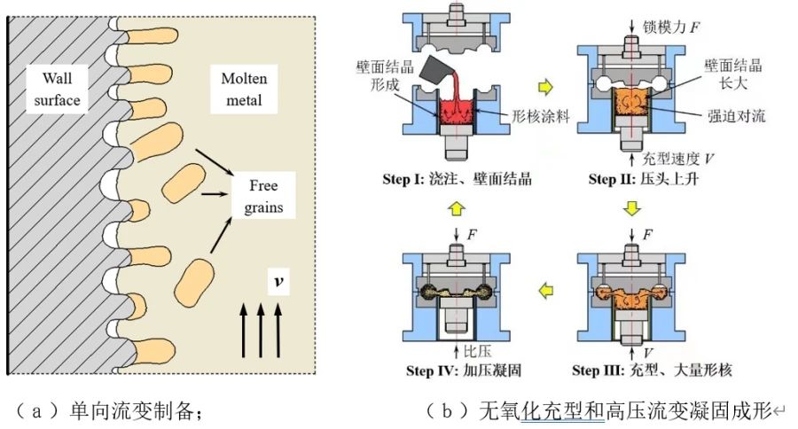 也就是說,流變會促進初生相的粗化長大。攪拌法制備半固態漿料的很多試驗也都證明,攪拌時間超過某一個臨界值,初生固相的尺寸會明顯增大。 3、隨流半固態成形技術 3.1 隨流半固態成形技術(SSMF)的概念 根據上述流變碰撞形核和流變合并長大理論,發明了隨流半固態成形技術(SSMF)。該技術是一種流變與凝固強耦合的半固態流變成形技術,在金屬液向模腔流動的過程制備出含有一定非枝晶初生固相的半固態熔體,并在密閉的惰性氣體保護下充滿模腔、在高壓條件下凝固成形,在液態金屬流變充型的過程中實現隨流形核和長大,并在隨后的半固態模鍛或鑄造的流變過程演變和剩余液相的凝固。其實現了漿料制備與工件的半固態成形制造的無縫連接,從而從根本上解決了半固態漿料制備、輸送與充型過程的氧化、吸氣等問題,縮短了傳統工藝流程,是一種材料制備成形一體化新技術,見圖2。
