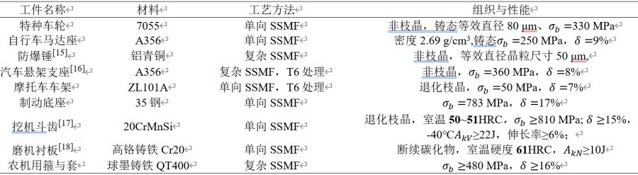圖4 復雜隨流半固態成形技術 復雜SSMF技術的主要工藝參數包括流動參數、流道參數、金屬液溫度及成形參數等。流動參數包括流動模式、流動壓力和流動速度的幅值和變化頻率;流道參數包括流道截面尺寸、流道形狀和流道長度;成形參數主要是成形壓強和持壓時間。這些參數都會影響半固態合金的組織和性能。其中流動參數、流道參數和金屬液溫度主要通過影響晶胚的碰撞頻率影響形核率,進而影響初生固相的尺寸。成形參數主要影響進入模腔的半固態熔體(漿料)在壓力作用下的流變和凝固。這方面與單向SSMF相同。成形比壓(壓強)越大,越容易使半固態熔體發生流變,進而促進流變形核和合并長大。持壓時間對單向SSMF的影響主要表現在凝固收縮能否被完全補充。如果在完全凝固前解除了壓力,則金屬的流變停止,隨后凝固產生的體積減小無從補償,便會形成縮松。 振動流變、攪拌、旋轉管、蛇形通道等都屬于復雜隨流半固態成形技術,液態金屬在特定的流道內進行振動、旋轉等復雜流動,流動過程液態金屬與通道之間發生熱交換,在流動的軸向和橫向都存在一定的溫度梯度,沿著流動的過程發生初生固相的流變形核和流變長大 3.4 隨流半固態成形技術(SSMF)應用示例 隨流半固態成形技術不要求較寬的結晶范圍,原則上適用于各種合金材料。目前已經在鋁合金、銅合金、碳素結構鋼、合金鋼、合金鑄鐵、球墨鑄鐵中進行了應用驗證,見表1。可以看出,隨流半固態成形技術可以細化各種組織并提高力學性能。