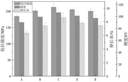式中:σs 為多晶體的屈服強度;d為晶粒的平均直徑;σ0 為晶內(nèi)對變形的阻力,相當(dāng)于單晶的屈服強度;K為晶界對變形的影響系數(shù),與晶界結(jié)構(gòu)相關(guān)。由此可知:晶粒越小,屈服強度越大,位錯難以運動。這是深冷12 h后,合金抗拉強度與塑性均得到提升的主要原因。