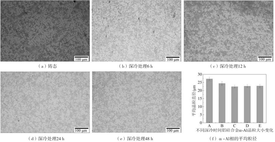 圖3 不同深冷處理工藝下壓鑄鋁硅合金的力學(xué)性能 2.2 深冷處理對 α-Al 相的影響 圖4是不同深冷處理工藝下壓鑄鋁硅合金α-Al相的形貌。對于鑄態(tài)壓鑄鋁硅合金,如圖4a所示,α-Al相較為粗大,柱狀晶較多。利用Image-Pro Plus分析測得平均粒徑為27.22 μm。圖4b是深冷處理6 h后的組織,α-Al相得到了細化且粗大的柱狀晶減少,但仍存在部分團聚現(xiàn)象,平均粒徑為24.42 μm。隨著深冷時間的延長,α-Al相得到進一步細化。當(dāng)深冷時間為12 h時,α-Al相最為細小,平均粒徑為22.41 μm。繼續(xù)增加深冷時間,與深冷12 h試樣相比,α-Al相平均粒徑略有增加,但其大小仍低于鑄態(tài)合金。總之,深冷處理能夠起到晶粒細化的作用,減少柱狀晶和α-Al相的團聚,促使組織結(jié)構(gòu)分布更加均勻。