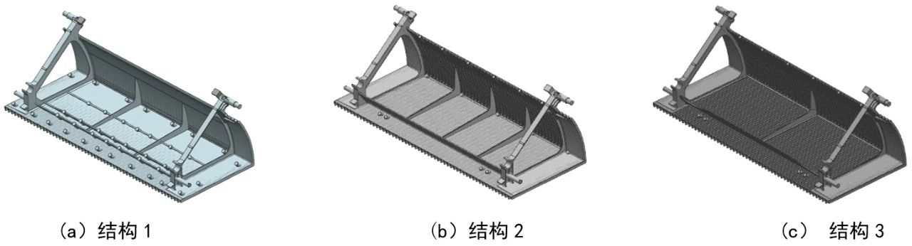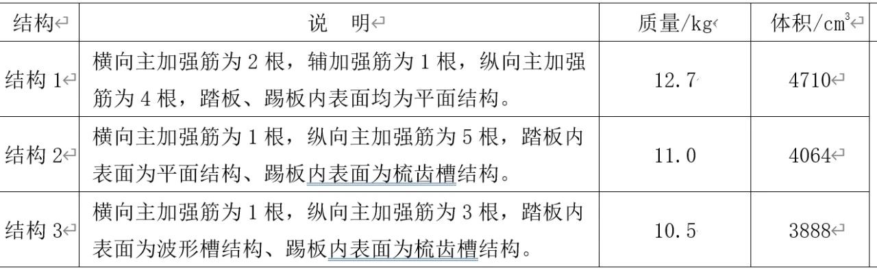 表1 A380化學成分及力學性能 1.2 梯級結構設計 在梯級結構設計中,既要考慮安全、技術要求符合國家標準,同時也要考慮整體式梯級的輕量化以及壓鑄工藝。梯級最大外形尺寸(長×寬×高)為1 009 mm×411 mm×340 mm,對3種不同的梯級結構設計進行分析比較,見圖2。 結構1:梯級壁厚為1.8 mm,橫向有2根主加強筋,筋板厚度為3.5 mm,高度為45 mm,長度為810 mm。同時為加強踏板的剛度,在踏板中間設計了一根小的加強筋??v向有4根主加強筋,筋板厚度為2 mm,見圖2a。 結構2:梯級壁厚為1.8 mm,橫向有1根主加強筋,筋板厚度為3 mm,高度為65 mm,長度為810 mm。縱向有5根主加強筋,筋板厚度為2.5 mm,見圖2b。 結構3:梯級壁厚為1.8 mm,壁厚均勻,橫向筋板最小端壁厚為3 mm,高度為85 mm,長度為810 mm??v向有3根主加強筋,筋板厚度2mm,見圖2c。