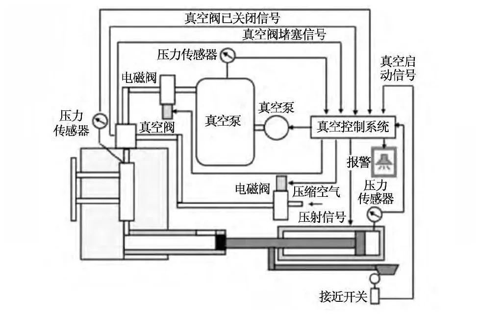 圖3 真空控制系統原理圖 為探討立體式激冷排氣閥的應用效果,選擇壓鑄油底殼零件進行試驗,產品結構 見圖4。其外形尺 寸為477.8mm×336mm×115.2mm,鑄件質量為4.1kg。該油底殼原采用普通的激冷排氣閥,其壓鑄工藝見圖5。如果由普通的激冷排氣閥改為立體式激冷排氣閥,需要對原方案的充型過程了解后,再對原方案進行優化,最終形成適合立體式激冷排氣閥的澆注系統以及排氣系統。對于原方案填充過程中鋁液的流動狀態進行分析,見圖6。