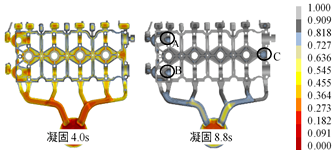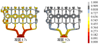 (b)凝固過程 圖6 改進方案的充型過程和凝固過程
