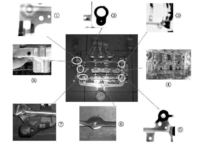 圖8 產品分區劃分及加工后廢品缺陷分布 凸輪軸支架生產過程出現的問題主要見圖9:①產品填充末端油道孔附近氣孔,機加工后油道孔與墊片安裝面氣孔外露;②φ18mm傳感器孔由于結構設計原因,很容易在該位置形成氣縮孔,實際生產中該孔機加工后報廢率也很高;③產品填充末端墊片安裝面與鏈條蓋安裝面氣孔,機加工后氣孔外露嚴重;④鑄件飛料嚴重,披縫很厚,產品清理與模面清理困難;⑤入料口右側墊片安裝面夾層;⑥入料口M6螺紋孔夾層;⑦入料口左側墊片安裝面夾層;⑧油道孔加工不過。