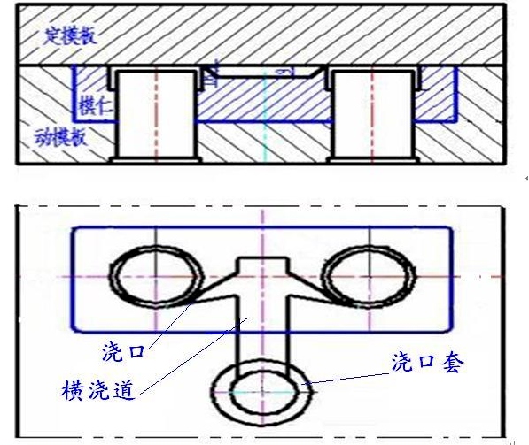 圖3 殼體分型面方案 (1)方案Ⅰ壓鑄模大型芯設(shè)在型芯固定板中,型腔和小型芯設(shè)在型腔板中,優(yōu)點(diǎn)是壓鑄件推出力小。缺點(diǎn)是壓鑄件2個(gè)φ6mm小孔與壓鑄件外圓φ56mm及內(nèi)孔φ48mm中心線的對稱度難以保證;壓鑄模分型面為壓鑄件下平面(裝配基準(zhǔn)面),上有飛邊,無法確保尺寸20mm及16mm的精度(見圖1),顯然此方案壓鑄件品質(zhì)難以保證。 (2)方案Ⅱ壓鑄模一部分型腔和大型芯放在型芯固定板中,壓鑄模另一部分型腔和小型芯放在型腔板中。缺點(diǎn)是壓鑄件2個(gè)φ6mm與鑄件外圓φ56mm及內(nèi)孔φ48mm中心線的對稱度難以保證,壓鑄模分型面設(shè)在有外圓的平面上,人為造成壓鑄件外圓有飛邊,鑄件外觀質(zhì)量差。 (3)方案Ⅲ壓鑄模型腔和大型芯設(shè)在型腔板中,小型芯設(shè)在型芯固定板中。優(yōu)點(diǎn)是鑄件飛邊不在鑄件安裝基準(zhǔn)面上。缺點(diǎn)是鑄件2個(gè)φ6mm小孔與鑄件外圓φ56mm及內(nèi)孔φ48mm中心線的對稱度有一定影響,但鑄件品質(zhì)基本能夠保證;以壓鑄件上平面做分型面,壓鑄件上平面上有飛邊。由于壓鑄件裝配時(shí)其飛邊被其他零件遮擋,故不影響鑄件在裝配后的外觀品質(zhì),此方案較為合理。 (4)方案Ⅳ壓鑄模型腔和大、小型芯全部設(shè)在動(dòng)模。優(yōu)點(diǎn)是可確保鑄件2個(gè)φ6mm小孔與鑄件外圓φ56mm及內(nèi)孔φ48mm中心線的對稱度。缺點(diǎn)是分型面設(shè)在壓鑄件下平面(裝配基準(zhǔn))上,鑄件裝配基準(zhǔn)面上有飛邊。此面為裝配基準(zhǔn)面,不能有飛邊,故此方案不合理。 方案Ⅴ壓鑄模一部分型腔設(shè)在動(dòng)模,另一部分型腔設(shè)在定模,大、小型芯全設(shè)在動(dòng)模。優(yōu)點(diǎn)是可確保鑄件2個(gè)φ6mm小孔與內(nèi)孔φ48mm中心線的對稱度。缺點(diǎn)是不能確保壓鑄件2個(gè)φ6mm小孔與壓鑄件外圓φ56mm中心線的對稱度,且以φ5mm外圓面做分型面,人為造成壓鑄件外圓面上有飛邊,外觀品質(zhì)差。綜合上述分析,選擇方案Ⅲ,以殼體上平面作分型面。