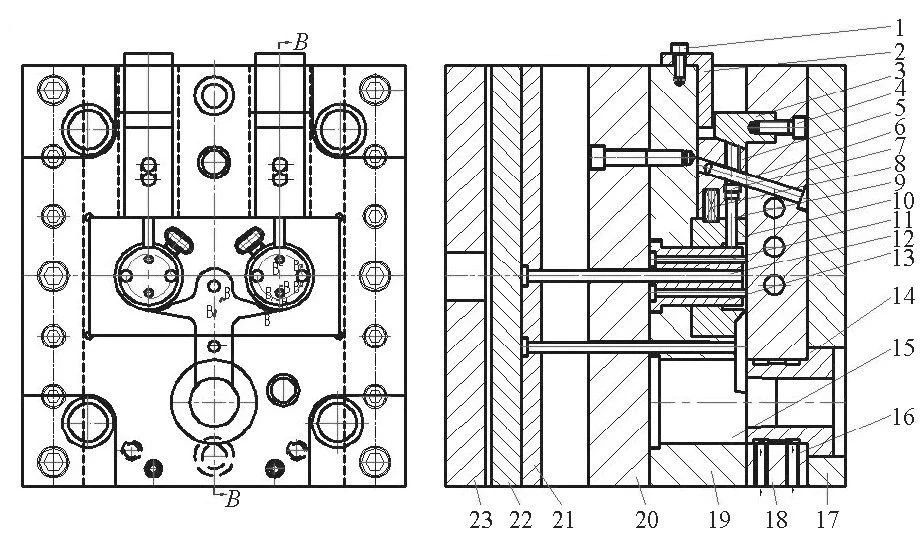 圖5 殼體壓鑄模裝配圖 1、4.內(nèi)六角螺釘 2.限位板 3.楔緊塊 5.滑塊 6.斜導(dǎo)柱 7.頂絲 8.彈簧 9.側(cè)型芯 10.動(dòng)模模仁 11.小型芯 12.頂桿 13.大型芯 14.澆口套 15.分流錐 16.銅管 17.定模座板 18.定模板 19.動(dòng)模板 20.支承板 21.推桿固定板 22.推板 23.動(dòng)模座板