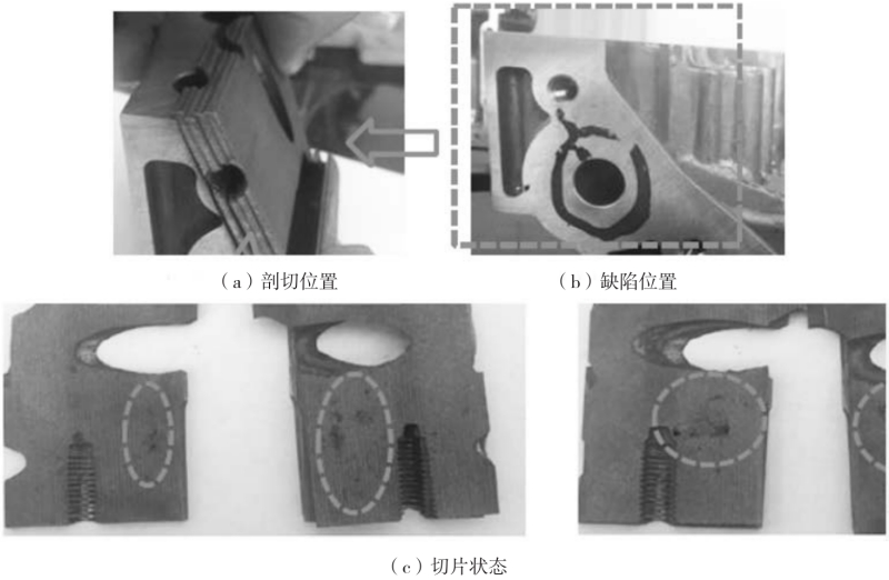 圖1 曲軸箱體形狀及泄漏位置 2、曲軸箱體泄漏的原因分析 2.1 泄漏原因調(diào)查 為調(diào)查曲軸箱體油道泄漏的原因,在泄漏部位側(cè)向Φ12 mm油道孔和M8螺栓孔連線方向剖切,發(fā)現(xiàn)缺陷部位在厚大壁厚處有小的縮孔和縮松,缺陷狀態(tài)如圖2所示。由于鑄件內(nèi)部有縮松現(xiàn)象,當(dāng)后序機(jī)械加工鑄件油道孔和M8螺栓孔時,將壓鑄件表層致密的激冷層破壞,在600 kPa的壓力下沿M8螺紋孔出現(xiàn)微泄漏。