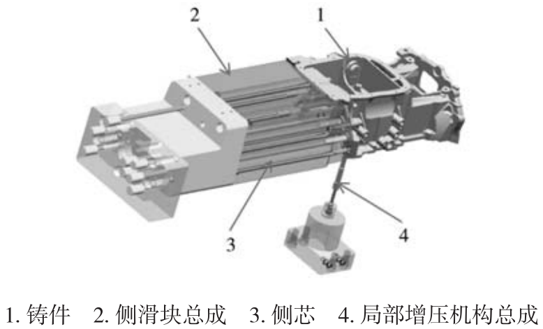 圖4 模具優(yōu)化設(shè)計 3.1 局部增壓機(jī)構(gòu)的結(jié)構(gòu)設(shè)計 局部增壓是在壓鑄成形后鑄件冷卻的過程中,對鑄件局部厚大部位存在孤立液相區(qū)的位置實施局部擠壓,通過液壓缸推動擠壓桿將預(yù)存空間內(nèi)的金屬液擠入鑄件中進(jìn)行補(bǔ)縮,是解決因壁厚厚大而產(chǎn)生縮孔的有效措施。曲軸箱體局部增壓結(jié)構(gòu)圖如圖5所示。根據(jù)曲軸箱體缺陷處的結(jié)構(gòu)形狀,將局部增壓機(jī)構(gòu)設(shè)計在動模,擠壓油缸用螺栓固定在動模套板后端。為防止擠壓桿與動模鑲塊的運(yùn)動磨損而影響配合精度,設(shè)計擠壓套零件。擠壓套固定在動模鑲塊上,與擠壓桿保證0.02 mm的配合間隙。根據(jù)孤立液相區(qū)的體積,設(shè)計擠壓桿直徑9 mm,最大擠壓行程10 mm,擠壓后與型腔底面平齊。按擠壓桿最大擠壓壓力4 500 kg/cm² 計算擠壓缸直徑應(yīng)為50 mm。