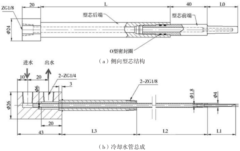 圖5 局部增壓機(jī)構(gòu) 3.2 側(cè)向型芯冷卻水結(jié)構(gòu)設(shè)計 由鑄件結(jié)構(gòu)可知,鑄件在側(cè)向除油道孔外有7處M8螺紋孔,由于M8螺紋孔的數(shù)量多,考慮在活動滑塊上位置度的影響,預(yù)鑄孔型芯成形處直徑最大,為5.6 mm,給型芯的冷卻帶來困難。曲軸箱體壓鑄模針對側(cè)滑塊細(xì)小型芯的冷卻,采用分體式冷卻結(jié)構(gòu),并使用高壓純凈水對型芯進(jìn)行單點強(qiáng)制冷卻。 分體式冷卻結(jié)構(gòu)見圖6,側(cè)向型芯采用兩體式,型芯前端材料SKD61,成形處冷卻水孔直徑2.8 mm,使用電火花穿孔機(jī)加工,型芯后端材料H13,冷卻水孔直徑6 mm。前端型芯與后端型芯采用M10×1螺紋連接。冷卻水密封采用O型密封圈徑向靜密封,材料選用氟橡膠或硅橡膠,要求工作溫度200~250 ℃,工作壓力15個大氣壓下不得泄漏。