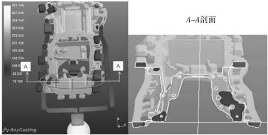 表2 鋁合金壓鑄件縮孔缺陷的成因?qū)φ毡?/p> 結(jié)合成因表的分析結(jié)果,對模具澆注系統(tǒng)的設(shè)計進(jìn)行再評價,確認(rèn)缺陷部位有分支澆道,能夠滿足金屬液充填的要求及增壓壓力的傳遞。采用模擬軟件用不同的壓鑄參數(shù)進(jìn)行模擬分析,結(jié)果在缺陷部位一直存在孤立的液相區(qū),如圖3中A-A剖面所示。 綜上分析確認(rèn)導(dǎo)致曲軸箱體油道泄漏的根本原因是鑄件局部壁厚厚大,鑄件在壓鑄成形后冷卻的過程中存在孤立液相區(qū),孤立液相區(qū)繼續(xù)冷卻過程中無法實現(xiàn)增壓補(bǔ)縮,最終形成縮孔和縮松。