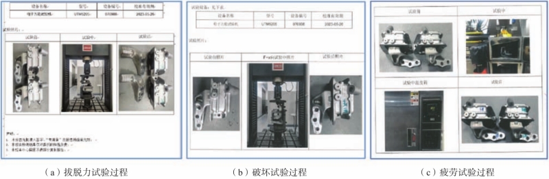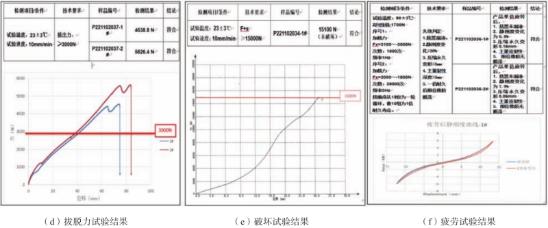 圖9 鑄件微觀組織 4、產品臺架驗證 半固態壓鑄支臂樣件臺架試驗包括:臺架拔脫力試驗、臺架疲勞試驗及臺架破壞試驗。樣件通過了以上臺架試驗,結果如圖10所示。