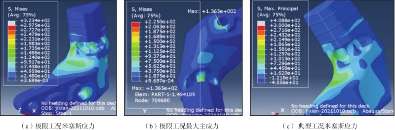 圖2 半固態支臂對地模態計算 極限工況米塞斯應力及最大主應力標準要求分別為低于85%材料抗拉強度及低于75%材料屈服強度,計算結果均達到了這個要求(圖3a-b)。典型工況米塞斯應力標準要求為低于75%材料屈服強度,計算結果達到了這個要求(圖3c)。